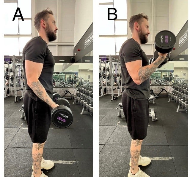 Notes: Stand with dumbbells in each hand, palms facing forward. Curl the weights up toward your shoulders, contracting your biceps. Slowly lower the dumbbells back down.